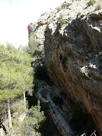 Ya para rematar, Fabián termina definitivamente el segundo largo de Kamikaze, posiblemente junto con su vecina No soy un Angelito la vía más larga de todo el sector. Su primer largo ya es un buen 7c y con este segundo parece que la cosa subirá hasta el 8a+. Otra que vuelve ha quedar lista para el consumo es precisamente también de Fabián, Desafiando a la gravedad, la cual tras la rotura de un par de cantos vuelve a su estado original. Aquí la cosa ya se complica un poco más y es que su trazado a lo Cuenca style no da respiro. Ésta quizá llegue al 8b+... ya lo veremos.
